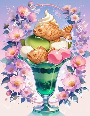 見た目も心をくすぐる「たいやき乗せ抹茶パフェ01(RN)」は、手作りのたいやきがトッピングされた特別な抹茶パフェです。深い緑色の抹茶アイスクリームが、見る人の目を惹きつけ、リラックスしたひとときを演出します。クリーミーな抹茶の風味と、たいやきのサクサク感が絶妙に調和し、まさに甘美な味わいを楽しむことができる一品です!食べるたびに心が豊かになることでしょう。