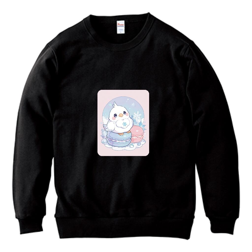 美しい冬の景色を感じる、雪鳥とマカロン01(LSブラック)のライトトレーナーです。漆黒の生地に映える雪鳥の優雅な姿と、マカロンの柔らかな色合いが織り成す独特な世界が、心をやさしく包み込みます。冬のスタイルを際立たせるための必見アイテムです。