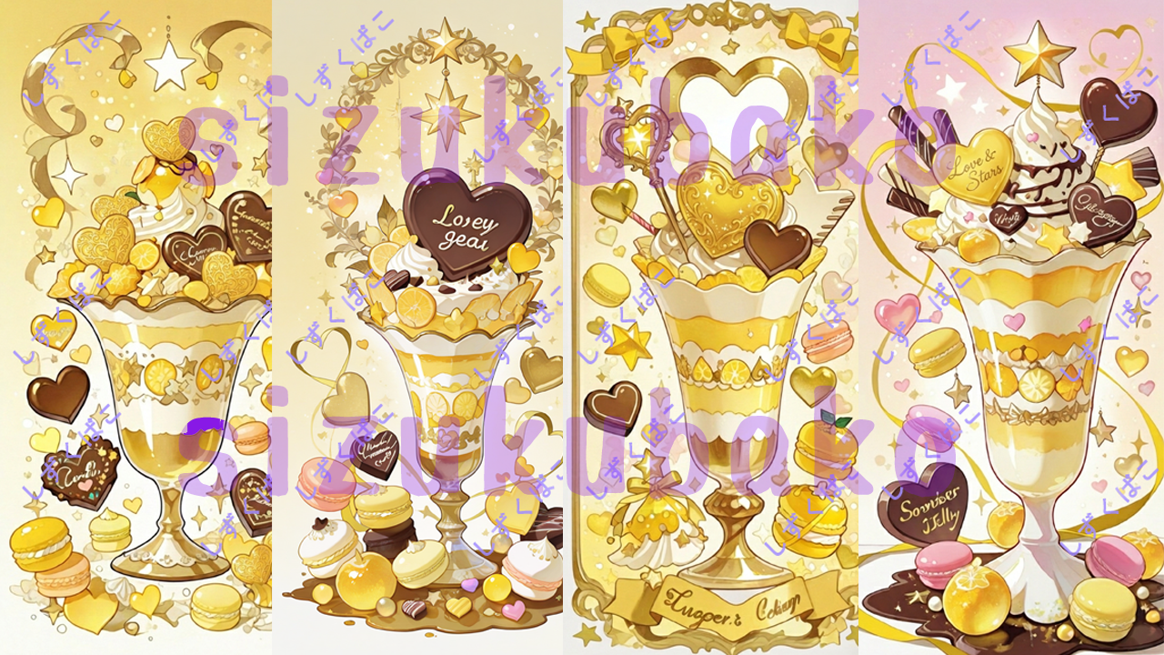 深みのあるゴールデンイエローと、きらきら輝くスイーツ層が重なり合う、ポップで明るい幻想パフェの世界観を詰め込みました