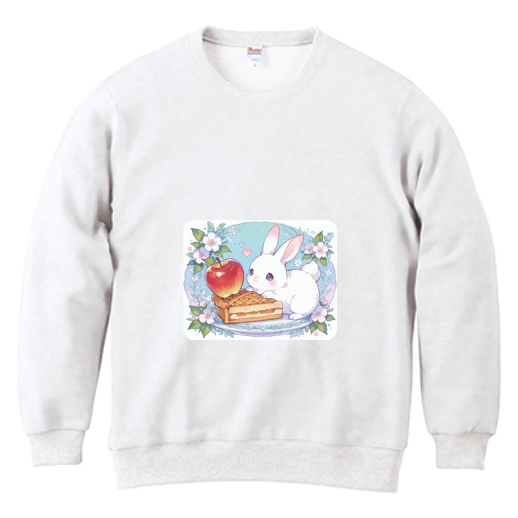 ウサギとアップルパイがデザインされたトレーナーが登場しました! おしゃれなホワイトカラーに、愛らしいイラストが映えるデザインが特徴です。普段使いにはもちろん、特別な日のおしゃれにもぴったりの一枚です。