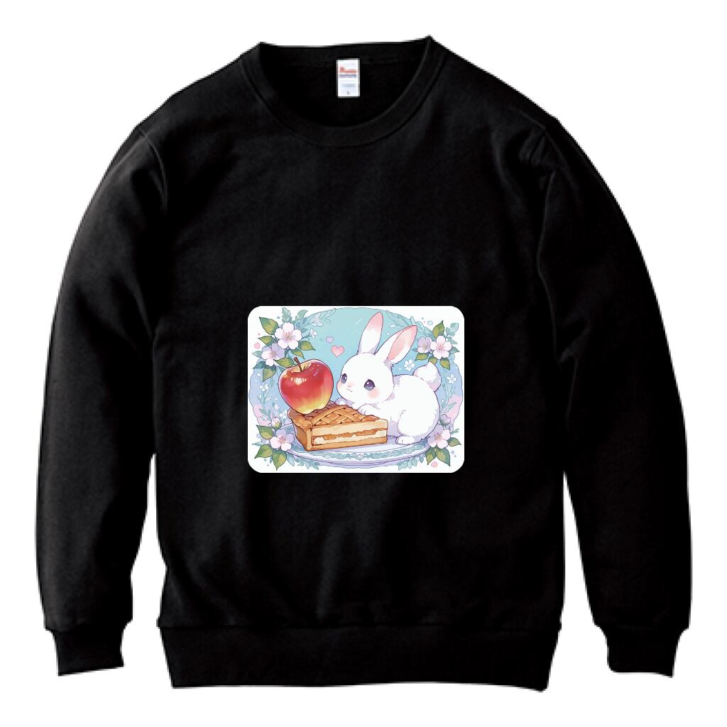 ウサギとアップルパイをテーマにしたトレーナーが登場! シックなブラックカラーが印象的で、柔らかな素材感が特徴です。可愛らしいデザインは、普段使いから特別な日のおしゃれスタイルまで幅広く活躍します。