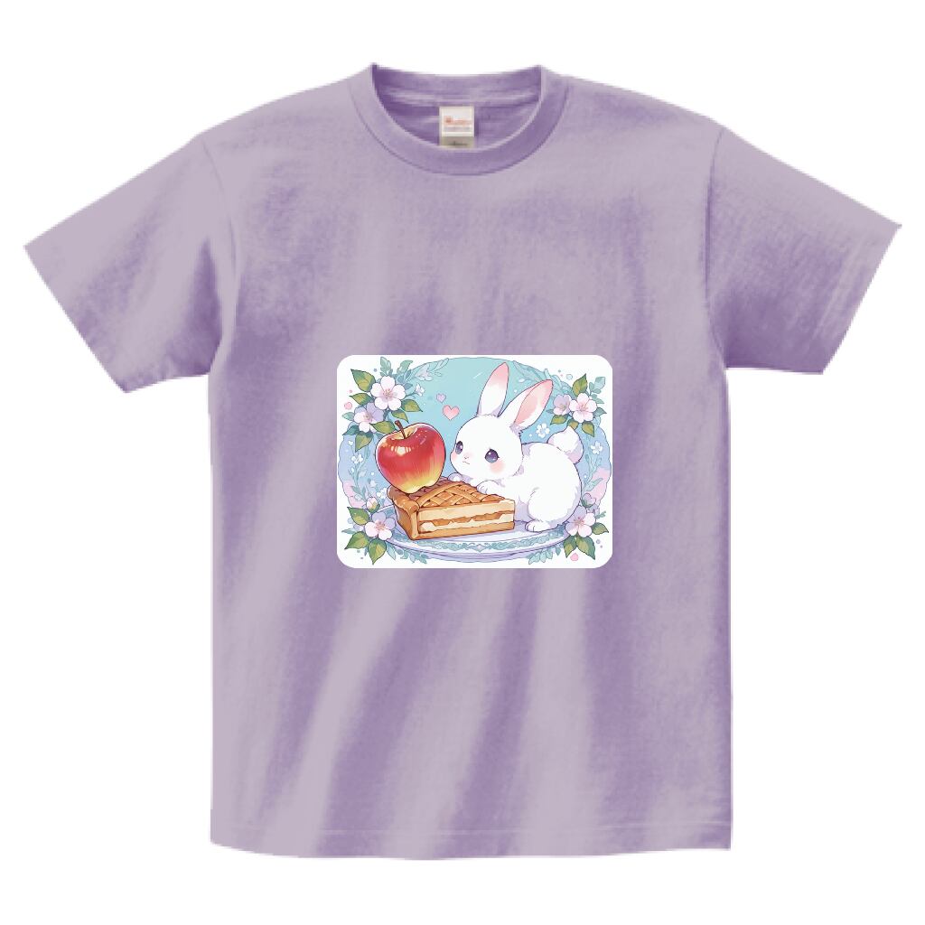 ウサギとアップルパイをテーマにしたTシャツが新登場! やさしいラベンダーカラーが魅力で、見る者を惹きつける愛らしいデザインが特徴です。デイリースタイルにも特別な日のおしゃれにも、幅広くご活用いただけるアイテムです。