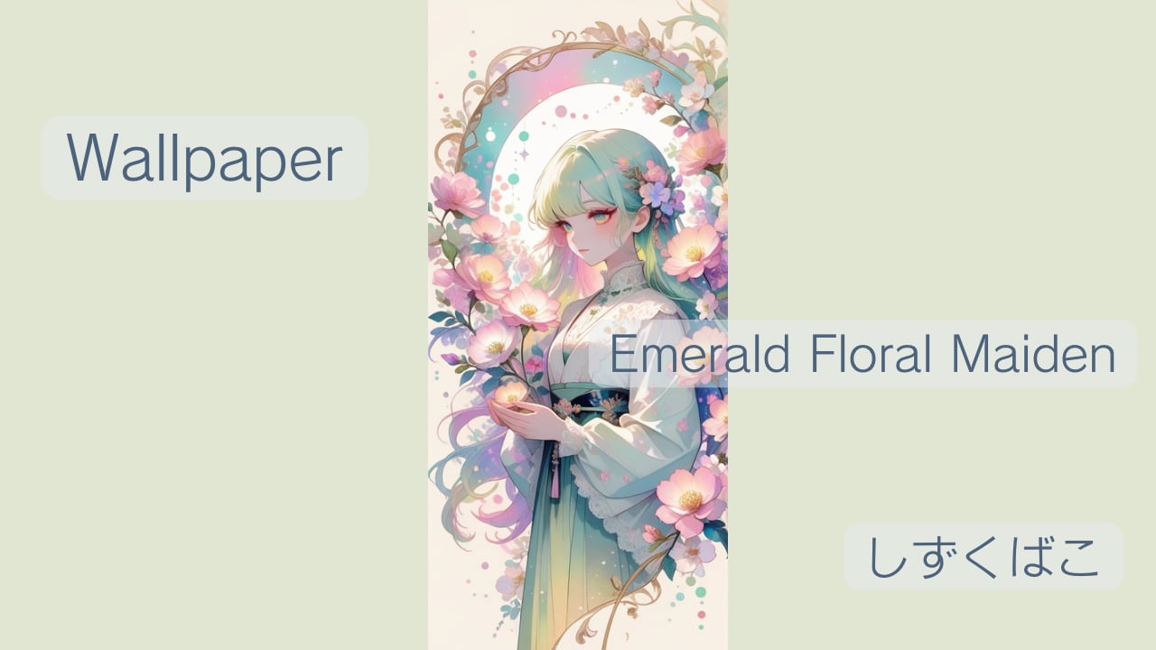エメラルドグリーンの髪と、優しく広がる花々が印象的なスマートフォン壁紙です。