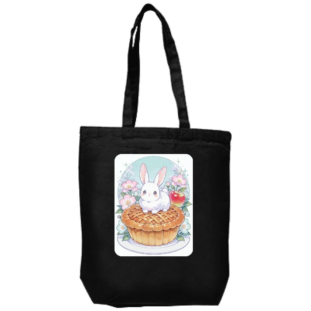 ウサギとアップルパイをテーマにしたオリジナルトートバッグ、ブラックが新たに入荷しました! 深みのあるブラックカラーは、どんなスタイルにも合わせやすく、シンプルながらもおしゃれな印象を与えます。デザインには遊び心が満載で、持つ人の個性を引き立てるアイテムです。しっかりとした作りで、通勤やお出かけ、買い物など、さまざまなシーンで活躍します。