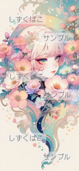 エメラルドグリーンの髪と、淡くカラフルな花々が広がる優しい世界観のスマートフォン壁紙です。