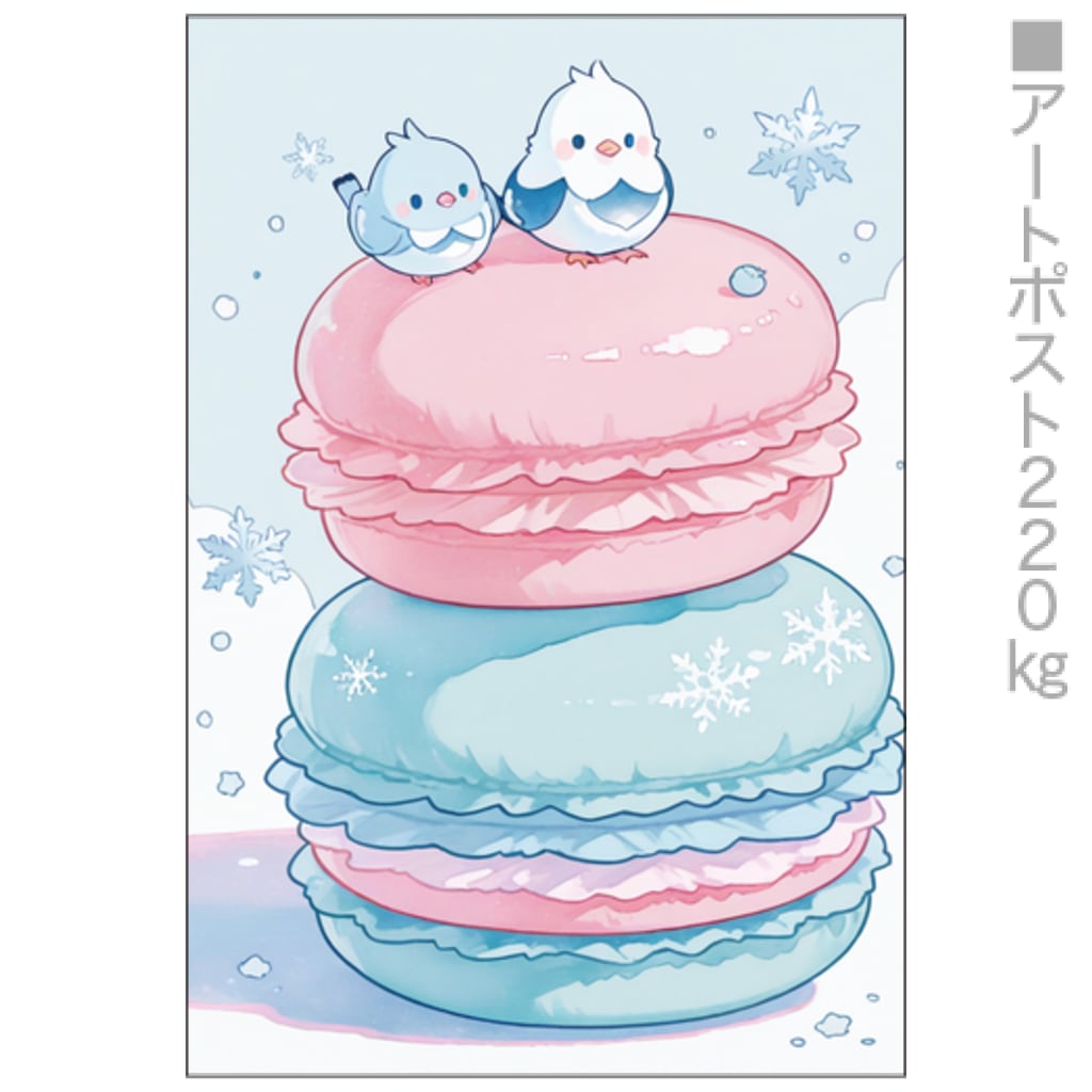 冬の小鳥とマカロンが描かれたポストカード、やさしいスイートアニマルの世界へようこそ。このポストカードは、愛らしいデザインと淡いパステルカラーが特徴で、日常の大切な瞬間を彩ります。お手紙やメッセージはもちろん、飾るだけでも心を癒す素敵なアイテムです。
